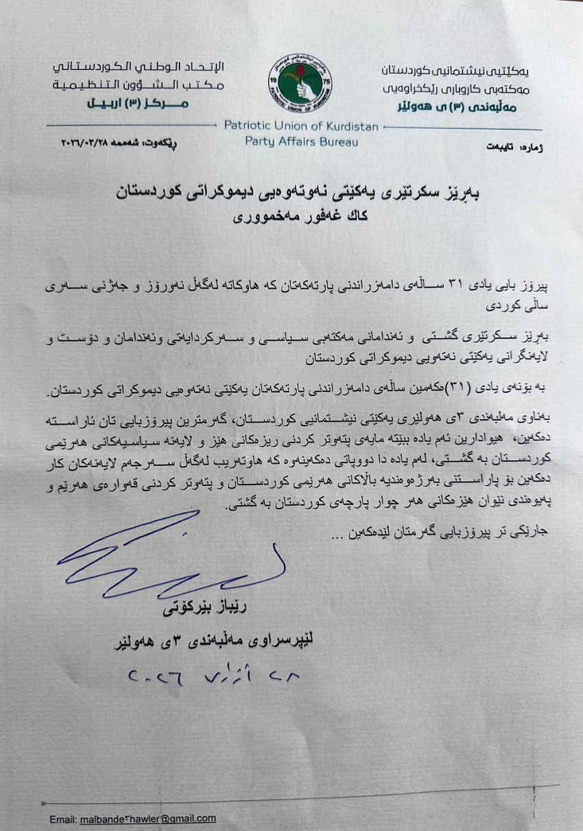 پەیامی پیرۆزبایی بەڕێز رێباز بێرکۆتی لێپرسراوی مەڵبەندی ٣ی هەولێری یەکێتیی نیشتمانیی كوردستان بۆ (31)ــه‌مين ساڵیادی دامەزراندنی یەكێتی نەتەوەیی دیموكراتی كوردستان YNDK.