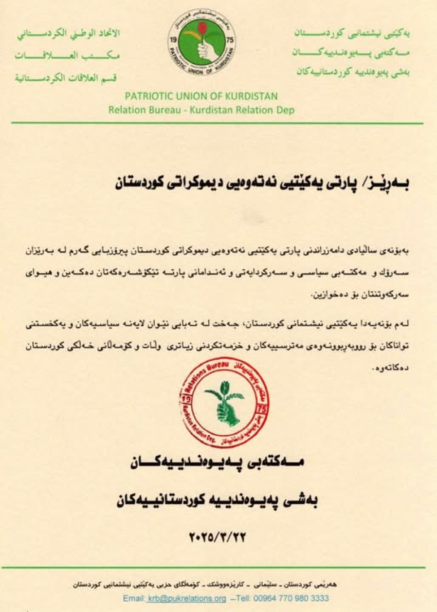 پەیامی پیرۆزبایی یەکێتیی نیشتمانیی كوردستان بۆ (31)ــه‌مين ساڵیادی دامەزراندنی یەكێتی نەتەوەیی دیموكراتی كوردستان YNDK.